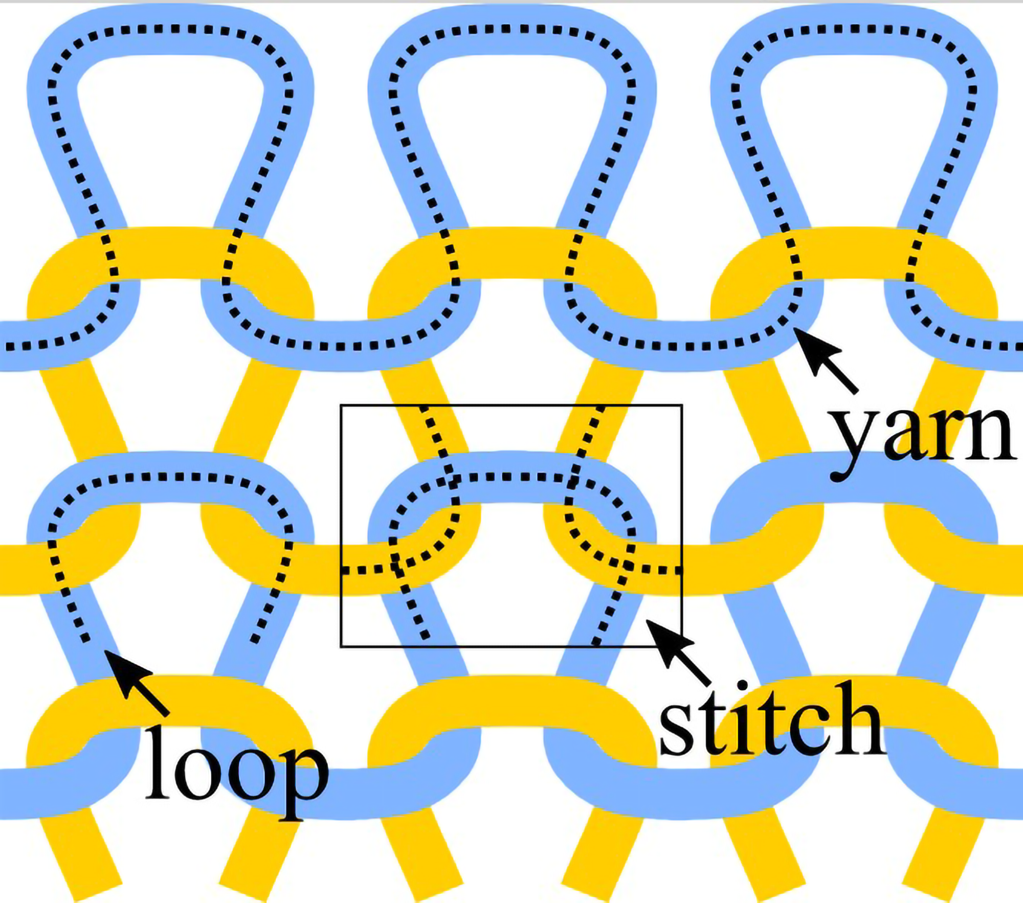 ; knitting pulls a loop of new yarn through the loops on a needle and drops those loops: